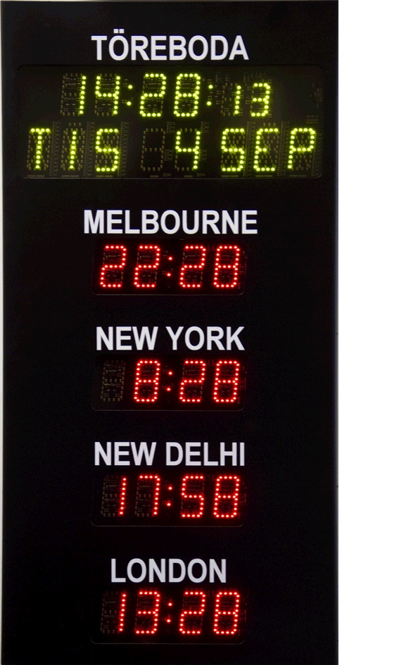 שעון דיגיטלי המיועד לשימוש פנימי המציג בין 4 – 5 אזורי זמן שונים ותאריך בנוסף (בתנאי DLS זהים או ללא ניתן עד 8)